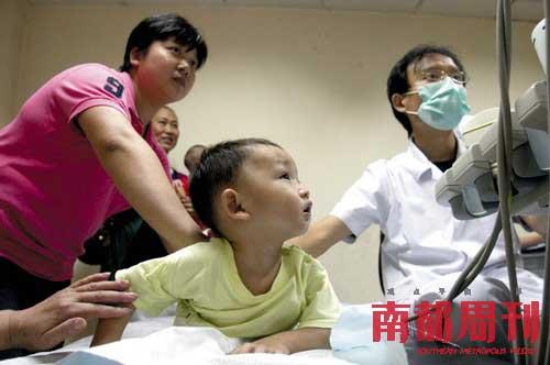 2008年9月17日,武漢市兒童醫院,近百位家長帶著孩子到醫院做B超體檢。1歲10個月大的楊凱清小朋友喝了5個月三鹿奶粉