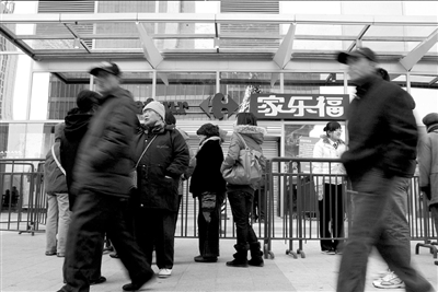 “說好今天開門的,怎么還攔著呢?”昨天,不少市民手提購物袋,來到位于石景山區萬達廣場的家樂福魯谷店,但該店仍貼著內部調整的告示,無法開業。20日,該店在開業當天曾提前數小時閉店,并貼出告示,稱將于26日上午8點30分再開門營業。