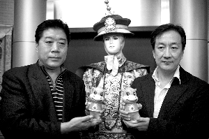 兩位草根皇帝李少華(左)和張濤(右)在展示地壇廟會的吉祥物。昨日,地壇廟會組委會宣布,老北京叫賣將首次進駐地壇春節廟會,并將為游客首次上演老北京叫賣情景劇。而地壇海選的新“皇帝”將于大年初一、初五扮演皇帝祭地。今年,地壇廟會在對小吃攤位進行拍賣的同時,還拿出五個位置絕佳的“黃金攤位”,請來了正宗“中華老字號”小吃的代表:東來順飯莊、白魁老號、護國寺小吃店、餛飩侯和茶湯李。(浦峰 李立強 攝影報道)
