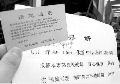這是一份不同尋常的征婚啟事。它印在名片上。言語(yǔ)中,滿是自責(zé)。文字來(lái)自于父母:當(dāng)年只要求孩子學(xué)習(xí)再學(xué)習(xí),努力再努力,而不顧人倫天理,堅(jiān)決反對(duì)女兒交往異性,時(shí)至今日雖悔悟自責(zé),然女兒青春難再……