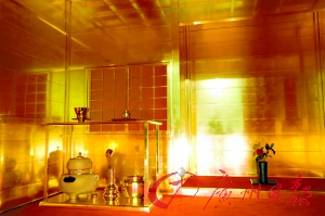 該茶室長(zhǎng)2.7米,寬2.55米,高2.5米。由日本長(zhǎng)野一家公司以日本戰(zhàn)國(guó)時(shí)代末期封建領(lǐng)主豐臣秀吉1587年修建的黃金茶室為原型,1比1復(fù)制而成。