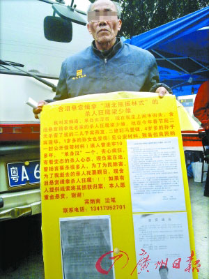 本報訊 (記者何濤)昨日下午2時30分,72歲的老漢賓炳南站在廣佛路口的馬路邊上,舉著一個大大的招牌:懸賞緝拿殺人狂魔!老人的舉動吸引了不少路人圍觀,站在細(xì)雨中的老人一遍遍地向圍觀的人講述他的故事:今年春節(jié)前兩天,他的兒子、兒媳、孫子3人在云浮的家中被殺,與他同村的梁某有重大作案嫌疑。當(dāng)?shù)鼐揭褜α耗嘲l(fā)出了懸賞通告,但為了早點抓到疑犯,他開始了奔走各地自發(fā)“民間通緝令”的歷程。