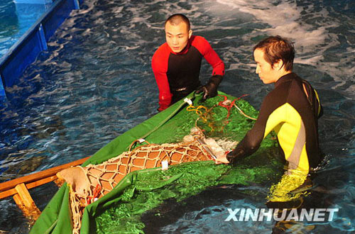 當日晚,廣東省漁政部門從廣州一家酒樓解救出一條護士鯊,并將其送到廣東省水生野生動物救護基地。據(jù)悉,此護士鯊為廣州某酒樓從水產(chǎn)市場購得,在酒樓水族箱里展示,接受食客們的預(yù)定。環(huán)保人士獲知后前往酒樓抗議護鯊,漁政部門隨即前往酒樓將其救出。護士鯊屬于廣東省野生保護動物,受到廣東地方保護法保護。新華社記者 盧漢欣 攝