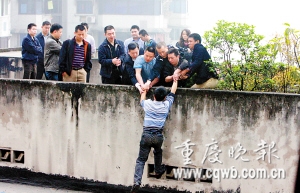“爸爸,不要跳樓!”昨日上午7時(shí)許,渝中區(qū)白象街31號(hào)10樓,5歲兒子周周(化名)撕心裂肺的哭聲,刺痛嚴(yán)某的心。“我不跳樓了。”兩小時(shí)后,嚴(yán)某嚎啕大哭放棄輕生念頭,雙手抱頭向警方投降自首——此前,他將妻子殺死在租賃房中,隨后上到樓頂決定跳樓輕生。