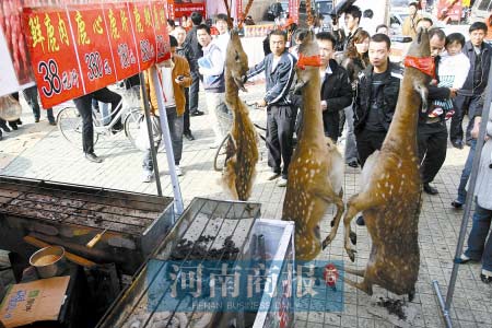 “呀!這是梅花鹿?是保護動物吧?太殘忍了!”圍觀的市民對攤位里穿著紅肚兜、伴著“舞曲”邊烤邊扭的攤主和他手里的“天價肉串”并不是很感興趣,而是對攤位前鐵架上懸掛的三只死去的梅花鹿指指點點。