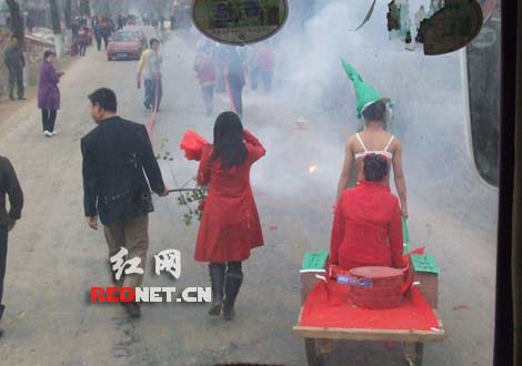 “誰若97歲死,奈何橋上等三年。”如果把這句歌詞中纏綿悱惻的場景搬到婚禮中演繹,會不會有點(diǎn)驚悚?25日上午,網(wǎng)友“鍋爐工”在紅網(wǎng)論壇發(fā)帖,再現(xiàn)了一場“雷人”婚禮,帖子描述道“這男人扮牛頭,拉個‘投胎轉(zhuǎn)世車’拖著老婆回家,新娘后面放著幾掛鞭炮,據(jù)說是驅(qū)鬼用,拉著上‘奈何橋’好恐怖啊!”