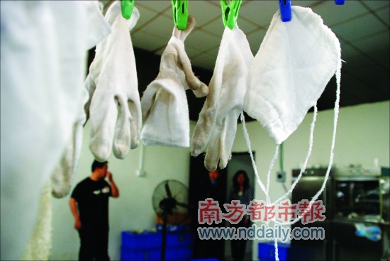 “要客戶收貨,就一定要讓所有的餐具上不能有一點(diǎn)油漬和殘渣,所以餐具打包裝之前,一定要用手套或毛巾擦干凈。”老板娘對記者說。然而,用于擦拭餐具的手套、毛巾都是隨處擺放,有的掛在電風(fēng)扇上,有的甚至放在地上。大部分手套的指尖部位都已經(jīng)發(fā)黑,甚至磨破了。