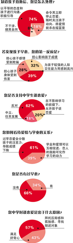 如果自己的孩子早戀,約七成人表示將以寬容理解的態度來處理。僅兩成受訪者表示,發現后會命令其立即停止戀愛,把愛情扼殺在搖籃中。另有一成人則表示“不干涉,順其自然”。記者 張淑敏