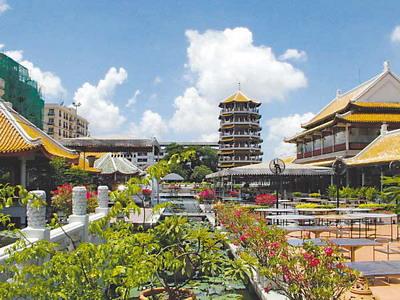 記者遠遠就看到了馬路邊上的飯店,就像一片蘇州園林。黃瓦紅柱、亭臺樓閣、小湖假山,完全是中式風格。走進大門,先看到一塊牌匾,上面是放大的吉尼斯世界紀錄證書,這份發放于1992年的證書上面記載的是:飯店面積8.35英畝(約合3.38萬平方米),員工1200名,可提供5000人同時就餐。記者在這里完全體會不出是在外國,吃的是中國菜,菜單上也有中文。據介紹,泰國大部分大型娛樂設施都是華人老板,這座“龍城花園酒家”也不例外。