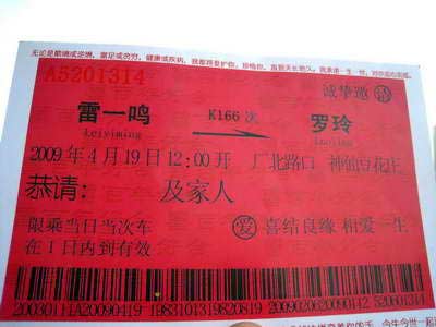 “太牛了,簡(jiǎn)直就是個(gè)牛人。”昨日中午11時(shí)多,在婚禮現(xiàn)場(chǎng),新郎的好友楊先生拿著明信片大小的“火車(chē)票”對(duì)記者說(shuō),原來(lái)來(lái)賓們手中所持的“火車(chē)票”都是結(jié)婚請(qǐng)柬,是由新郎雷一鳴自己設(shè)計(jì)的。