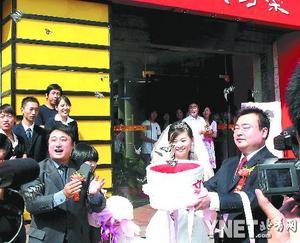 日前,在海淀區一家飯店前的空場,一對新人在司儀的引領下,在交響樂“梁!钡陌樽嘞,輕輕打開了一個粉色“竹籃”,數十只形色各異的蝴蝶隨即從籃內飛向藍天。