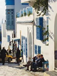 有一幢房屋,綠色的樹和紅色的花緊貼著白墻生長,只露出藍色的門窗。我恍惚起來,這不是童話里最迷人的場景嗎?在這樣的場景里,藍色的門被推開,走出了童話里的阿拉伯公主,她回眸一笑,然后沿著鵝卵石小街邊的臺階,一步步地走下去,走到一望無際的地中海邊。我也沿著臺階走下幾步,那里是一個露天咖啡館,坐在木質長椅上,點一杯突尼斯人最愛喝的薄荷茶,倚著欄桿,面朝大海,不知不覺間人便沉靜了下來,漸漸地好像融化在純凈的藍色與白色里。