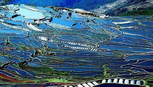 海拔2500米的云南哀牢山區(qū)元陽(yáng)梯田平地極少,到處是濃綠的原始森林的哀牢山區(qū),世代居住著哈尼族為主的山地居民。2500年前,哈尼族的祖先從西藏高原來(lái)到云南南部這個(gè)邊陲山區(qū),初來(lái)乍到就遇到了一大難題:周圍的山谷根本不適宜種植。哈尼族人以頑強(qiáng)的民族性格與大自然搏斗,用石塊砌起圍墻,圍住新開(kāi)墾的農(nóng)田,還引來(lái)山泉灌溉,并在水霧繚繞的梯田中種植稻谷。
