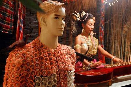 進入餐廳的室內區,就像進入安全套的博物館。墻壁上都是全球具有代表性的安全套產品的展覽,按照國別分裝在各自的格子里,不同的材料、顏色、形狀,漫步一圈能大致了解安全套的發展史。屋頂的吊燈也以安全套作為裝飾,閃出不同顏色的光芒。餐桌設計也很獨特,桌面玻璃板的圖案是由安全套組合完成。靠墻的餐桌旁還能欣賞到一幅幅被“加工”過的名畫,連舉世聞名的蒙娜麗莎也客串了一回安全套的宣傳大使,手中拿著安全套沖著客人微笑。