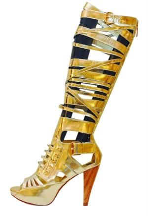 搭配指南:金色夸張的捆綁式高靴,因?yàn)楸旧砭秃軓?fù)雜,所以身上的服飾最好以簡(jiǎn)潔為主。復(fù)古透明金鞋很百搭,休閑場(chǎng)合也能成為焦點(diǎn)。
