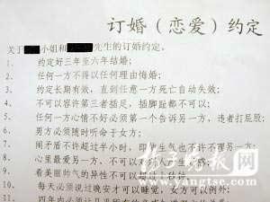 “約定好3年至6年結(jié)婚”、“吃飯前必須默念對方的名字一次”、“任何一方心情不好必須第一個告訴另一方,違者打屁股”、“每天思念對方的時間不可少于3小時,不可多于24小時”……揚州大學(xué)大一男生陳翰和在安徽求學(xué)的女友廖倩,近日簽訂了一份《戀愛約定》。端午小長假,陳翰將帶著這份“合約”回家,請家長簽名。