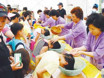 隨后,朋友陪同記者參加慶祝活動(dòng),記者看到姑娘們用菖蒲根做成簪子別在頭上,男人們則將菖蒲根纏在腰上。朋友說,這象征可以防止頭痛和災(zāi)厄的發(fā)生。慶祝活動(dòng)中有很多儀式,孩子用菖蒲水洗頭發(fā),祈求健康;人們點(diǎn)燃許愿燈,祝愿家人平安。來自農(nóng)村的民俗表演是整個(gè)活動(dòng)中最熱鬧的。小伙子舞動(dòng)繪有龍圖案和寫有“農(nóng)者天下之大樂”等字樣的大旗,身穿韓服的人們邊敲鼓邊圍成圈跳舞,一些人則裝扮成小丑,穿插在隊(duì)伍里,場面很熱鬧,他們用這種形式表達(dá)豐收的喜悅。朋友說,端午最有代表性的娛樂活動(dòng)就是女性聚在一起蕩秋千,男人聚在一起摔跤。端午當(dāng)天,也有將曬干的艾葉放在大門旁邊以除災(zāi)驅(qū)邪的習(xí)俗,韓國人喝菖蒲酒,還將扇子作為禮物贈(zèng)送,不少商家趁此機(jī)會(huì)熱賣扇子。
