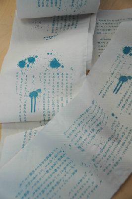 據報道,這篇印在衛生紙上的恐怖小說為鈴木光司的新作《Drop》,共9章,內容恰好是發生在公共廁所里的故事。文字是用藍色墨水印刷在衛生紙上,模仿水跡的樣子。為配合人們通常每次如廁用紙約80厘米的使用量,在80厘米長的衛生紙內印有差不多2000字。