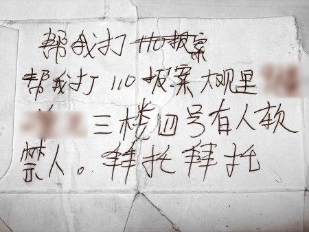 “幫我打110報案……有人軟禁人,拜托拜托。”昨日下午2點,家住成都大觀里某小區的一位大爺正在小區內散步,突然,一張硬紙條歪歪扭扭地從三樓窗戶飄落下來,大爺拾起一看,大吃一驚,立即將紙條交給小區門衛。5名警察接警后立即出動……