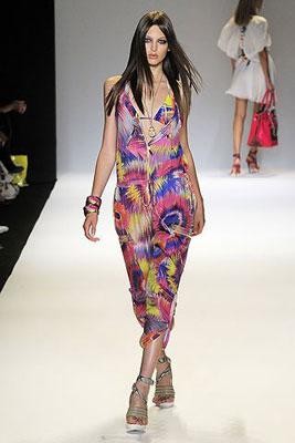 英國(guó)著名服裝設(shè)計(jì)師Matthew Williamson本季帶來(lái)了色彩斑斕的連體衣,嫵媚動(dòng)人。甜蜜而繁復(fù)的扎染印花是夏天的味道,飽和的色彩,肆意的視覺(jué)刺激充滿異國(guó)情調(diào)。長(zhǎng)至小腿中部,超低V領(lǐng)的簡(jiǎn)潔廓形又有些嬉皮味道的調(diào)侃。這樣的連體衣,要避免繁榮復(fù)雜的細(xì)節(jié)搭配,簡(jiǎn)單的配飾就足以讓你成為焦點(diǎn)。