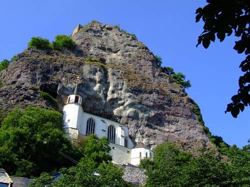 巖石教堂位于德國風景優美的伊達爾—奧伯施泰因小鎮旁。這里是德國著名的寶石之鄉。走在小鎮的石板路上,記者老遠就看到鎮外山上巖石峭壁上的白色小教堂。