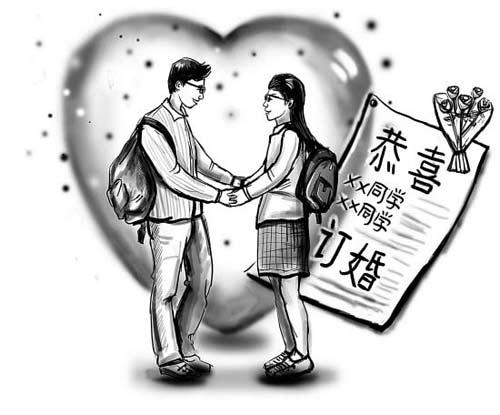 可當事人的特殊身份,卻讓記者幾度懷疑這是虛假消息——訂婚的正是小記者的同學,杭州某中學高三兩位剛剛參加完高考的學生。現在大學生結婚也少有人能接受,乍聽說這則中學校園里傳出的雷人婚訊,記者半晌沒回過神來。