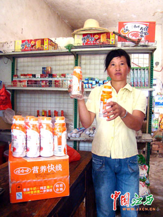 當(dāng)日上午,記者驅(qū)車來到墩上村實地采訪。今年41歲的鄒根枝兒女都在外務(wù)工,和丈夫鄒新海兩人在家?guī)腿搜b殼子板,每天120多元的收入讓兩人很是滿足,平時除了吃飯外還特意買些原料補充營養(yǎng)。鄒根枝介紹說:“6月20日,我從墩上村鄒德水的便利店里買來一箱娃哈哈營養(yǎng)快線,當(dāng)時怕飲料不新鮮,還特意看了生產(chǎn)日期,見是2009年5月31日生產(chǎn)的才放心買了回去,放在家里晚上看電視的時候喝,有些時候我老公(鄒新海)也喝一瓶,但沒有我喝得多。幾天后,我感覺肚子不舒服,上吐下瀉,為此專程搭車到萬年縣石鎮(zhèn)街去買胃藥,花了差不多200元錢病情卻不見好轉(zhuǎn),而且肚子痛得特別厲害。沒有辦法,我只好到屋前的墩上衛(wèi)生所去看病,打了幾天吊針以后病情才有所好轉(zhuǎn)。這次看病不僅花費了近400元醫(yī)藥費,還耽誤了一個多星期沒有干活,就連前兩天插秧都是請人干得,我的損失可大了。”