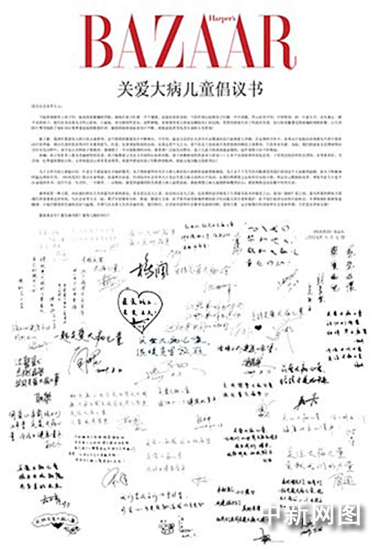 中新網(wǎng)8月10日電 今日,時尚雜志《時尚芭莎》攜手百位明星、名流和企業(yè)家發(fā)起聯(lián)名倡議,呼吁政府相關(guān)部門、各級慈善公益組織,共同關(guān)注中國大病兒童這一弱勢群體的生存、救助問題。同時,《時尚芭莎》宣布將于9月底在京舉行,本屆活動募集的所有善款都將全部捐助給國內(nèi)大病兒童救助公益事業(yè),以此慈善盛舉向偉大祖國六十華誕獻(xiàn)禮。