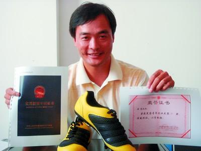家住芙蓉區的周凱說,這雙球鞋的設計得追溯到幾年前。“那天,我從電視轉播上看到貝克漢姆射出一個漂亮的弧線球,當時就被震驚了。從那以后,我就時常想,是不是我也能踢出一個這樣的弧線球。”經過20幾次修改圖紙,2005年,周凱向國家知識產權局提交了申請報告;2006年5月,產品獲得“實用新型專利證書”,產品名稱就叫:可加快足球旋轉的足球鞋。今年5月,周凱又憑此鞋獲得了“芙蓉青年創業大賽銀獎”。