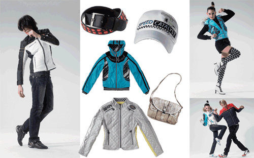 配合著這樣的理念,印滿字母的T恤街頭感十足,一副酷酷的壞壞的樣子讓男生的吸引力上升。外面搭配白色的茄克更顯帥氣清爽,一條做舊的牛仔褲復古感覺強烈,黑白為主色的運動鞋與整體的色系相統一。而女裝有以純黑基本色為主色調,羅紋與真皮相結合,加以局部白色設計點綴,整體服裝風格給人以簡潔干練的感覺。胸前的立體紋案設計,將賽車與休閑完美地結合在一起。白色弧形剪裁分割線,既完美勾勒出女性的優美曲線,又凸顯女性自信獨立的氣質。