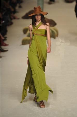 Hermes以面料的質感和些微色度的差別豐富了視覺的層次,特別的是胸前扣搭的斜肩皮帶,加上牛仔帽的點綴,不難看出設計師對西部靈感的堅持。