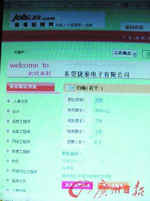 南粵招聘網工作人員白小姐昨日下午稱,他們網站不可能發布這樣的信息,如果發現肯定會將其刪掉。隨后,她讓記者把相關事宜留言到其網絡上,并表示第二天會向公司匯報作出處理。