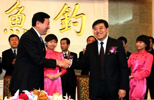 阜新市市長(zhǎng)潘利國(guó)(前排左)和伊利集團(tuán)董事長(zhǎng)潘剛(前排右)出席并簽署協(xié)議。
