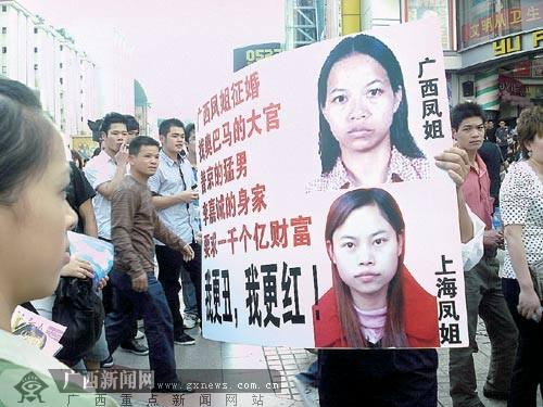 “找奧巴馬的大官、普京的猛男、李嘉誠(chéng)的身價(jià)、要求一千個(gè)億財(cái)富……”4月11日下午,一男子在南寧市裕豐商廈門前,舉出“廣西鳳姐征婚”的廣告牌,聲稱要為自己的一位親戚——“廣西版鳳姐”征婚。當(dāng)天在現(xiàn)場(chǎng),所謂的“廣西鳳姐”故作神秘沒現(xiàn)身,但其開出的征婚條件卻“雷倒”了眾多圍觀市民。這也引起了一些好奇市民的猜想和質(zhì)疑:“廣西鳳姐”是不是想學(xué)新近的“網(wǎng)絡(luò)紅人”——羅玉鳳(“鳳姐”)來(lái)出名?