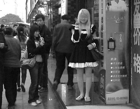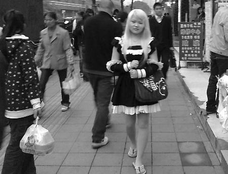 在人潮如織的大街上,一位身穿黑色女仆裝的金發(fā)女孩,正悠然自得地閑逛著——這仿佛日本動畫片中的場景,前日下午,竟在大坪正街上演。原來,這位17歲的女孩,是一位地道的日系“動漫族”,有時候是女巫裝,有時則是人型電腦裝,幾乎每天她都會按照日本動漫角色的穿著出門。