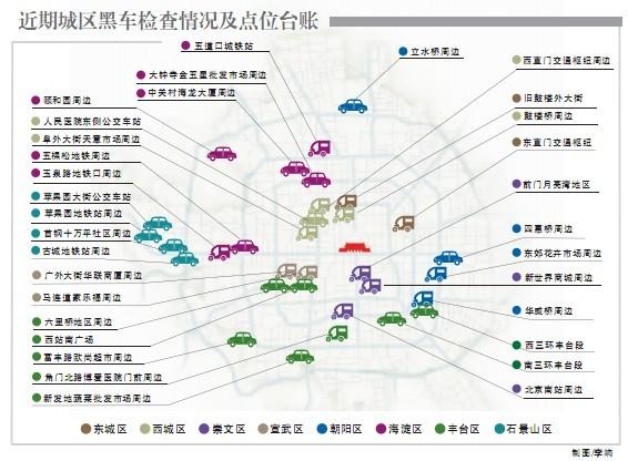 分布在“黑車地圖”上的128個重點地區中,東城6處、西城10處、崇文8處、宣武15處、朝陽28處、海淀19處、豐臺33處、石景山9處。其中,豐臺、海淀和朝陽三區的黑車分布點以絕對優勢占據前三甲,總量占到近7成。