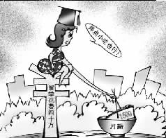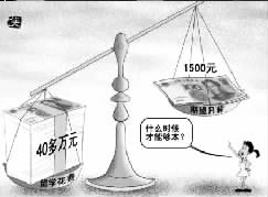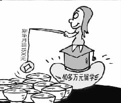 漫畫四:新浪網(wǎng)貼出的漫畫是一桿嚴(yán)重傾斜的秤,一頭是40萬百元大鈔,一頭是1500元大鈔,題為“留學(xué)所花40多萬元啥時(shí)才能賺夠本?”的文字說明憂心忡忡:不吃不喝,想要賺回40萬元得花20年。(萬建輝)