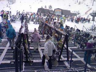 休息大廳前,大家都把滑雪器材放在這里,然后去休息。最近時興滑板子,所以放眼望上去都是各色滑雪板。