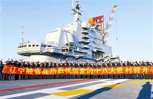 中新網11月8日電 據中國軍網海軍頻道報道,11月7日,我軍首艘航母、海軍“遼寧艦”上千名官兵展開鮮紅的彩色條幅,高聲歡呼,歡慶黨的十八大勝利召開。