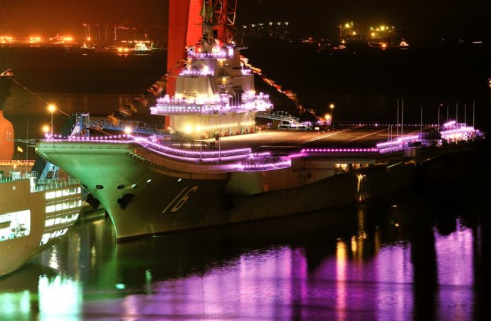 “遼寧艦”節日期間霓虹燈閃亮裝點海灣