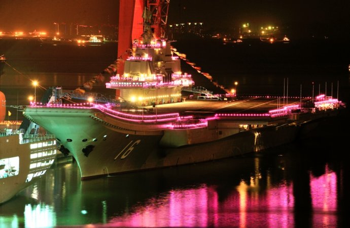 “遼寧艦”節日期間霓虹燈閃亮裝點海灣