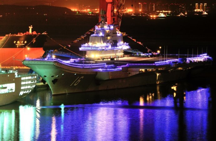 網(wǎng)友拍我航母平臺“遼寧艦”節(jié)日期間霓虹燈閃亮裝點(diǎn)海灣