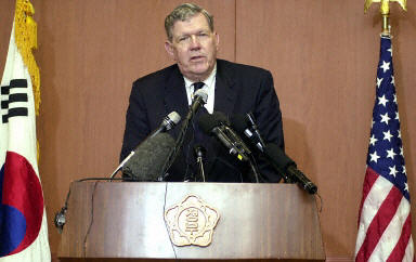 據(jù)“中央社”報道,凱利以美國布什總統(tǒng)的特使身份訪問漢城,在會見韓國總統(tǒng)當(dāng)選人盧武鉉之后,在漢城外交部舉行新聞發(fā)布會。