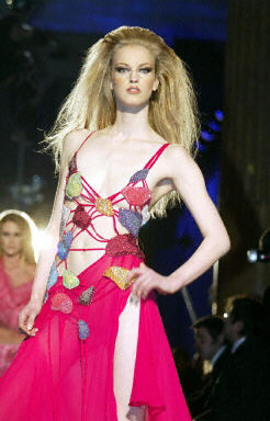 1月26日,羅馬時裝周上模特展示了2004春夏時裝最新流行趨勢。圖為模特展示意大利設計師Gai Mattiolo 的作品。