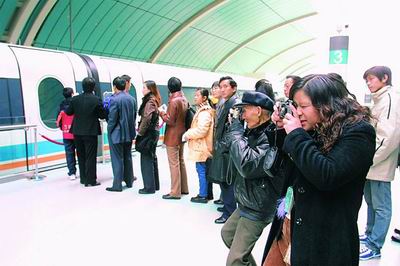 圖為磁浮列車發車前,游客們紛紛拍照留念 樓文彪攝