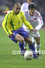 中國(guó)隊(duì)遂展開反撲,在此后的十五分鐘內(nèi)連續(xù)獲得多次攻門良機(jī)。最佳機(jī)會(huì)出現(xiàn)在四十分鐘,當(dāng)時(shí)孫繼海左路拉開巴西隊(duì)防線,邊路傳中,禁區(qū)內(nèi)的李毅在無(wú)人防守的情況下,竟然頭球射門偏出。喪失了最好破門機(jī)會(huì)的中國(guó)隊(duì),只好與巴西隊(duì)平局結(jié)束上半場(chǎng)。