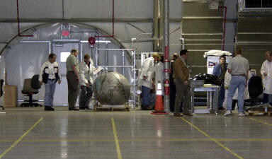 從路易斯安娜和德州經(jīng)過分析對(duì)比后的“哥倫比亞”號(hào)殘骸被陸續(xù)運(yùn)抵位于弗羅里達(dá)的肯尼迪航天中心,展開更深入的調(diào)查失事原因工作。圖為KSC工作人員接收殘骸物件進(jìn)行匯總登記。