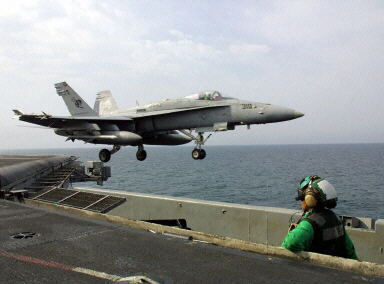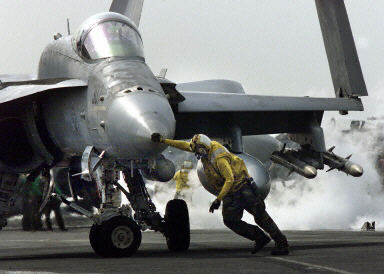 圖為:為推翻伊拉克薩達姆政權,美國防部派往阿拉伯海的美國“尼米茲”級核動力航空母航“林肯”號,F/A-18"超級黃蜂"戰斗機進行常規訓練任務,準備彈射起飛(1)