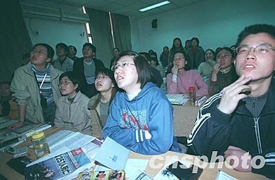 圖為清華大學新聞系正在上課的學生得知該消息后感到非常驚訝。作者:張勤