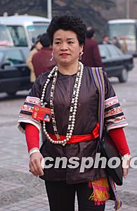來自貴州的全國政協委員王先瓊(侗族)身著民族服裝前來北京參政議政。作者:張煒